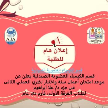 The Department of Pharmaceutical Organic Chemistry announces the date of a mid-term exam and a second practical theoretical exam in Dr. Ola Ibrahim's part - for first year students, Pharm D year