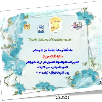 Thesis defense of the master’s degree / Dalia Nashat Erian - Assistant Lecturer and Registrar for the Doctorate Degree in Pharmaceutical Sciences (Pharmaceutics) - on Wednesday, November 9, 2023