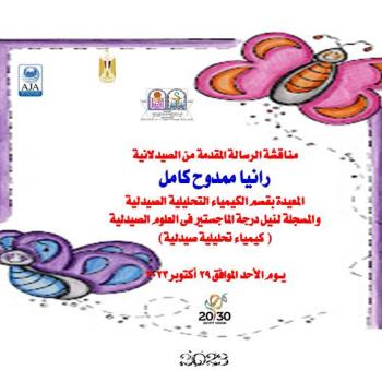 Thesis defense of the pharmacist Rania Mamdouh Kamel - teaching assistant in the Department of Pharmaceutical Analytical Chemistry and registered to obtain a master’s degree in Pharmaceutical Sciences (Pharmaceutical Analytical Chemistry) on Sunday,