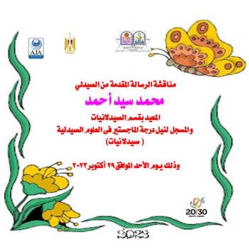 Thesis defense of the pharmacist/Mohamed Sayed Ahmed - teaching assistant in the Department of Pharmaceutics and registrar for obtaining a master’s degree in pharmaceutical sciences (pharmaceutics), on Sunday, October 29, 2023, at twelve o’clock (noon).
