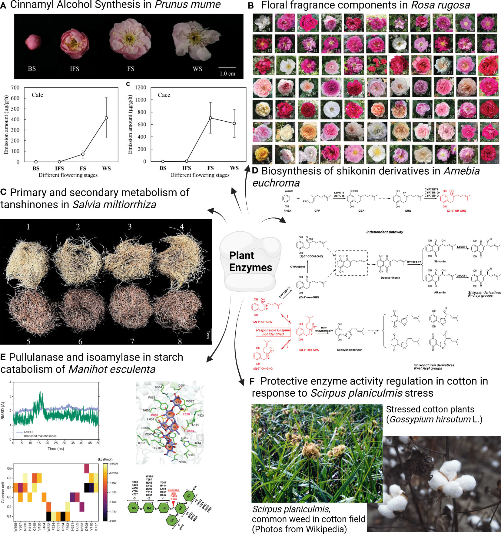 Plant enzymes are indispensable for plant metabolism and are critical determinants of the extensive chemodiversity observed in plants. These enzymes serve as primary catalysts in biosynthetic pathways, enabling the biosynthesis of a diverse range of secondary metabolites, such as alkaloids, terpenes, and phenolics. These metabolites are essential for the distinctive sensory qualities of plants, e.g., flavors, scents, and colors, and they also possess significant biological activities with promising applications in agriculture, medicine, and industry. Recent scientific investigations have been devoted to unraveling the intricate biochemistry of enzymes in photosynthetic organisms, elucidating their catalytic
