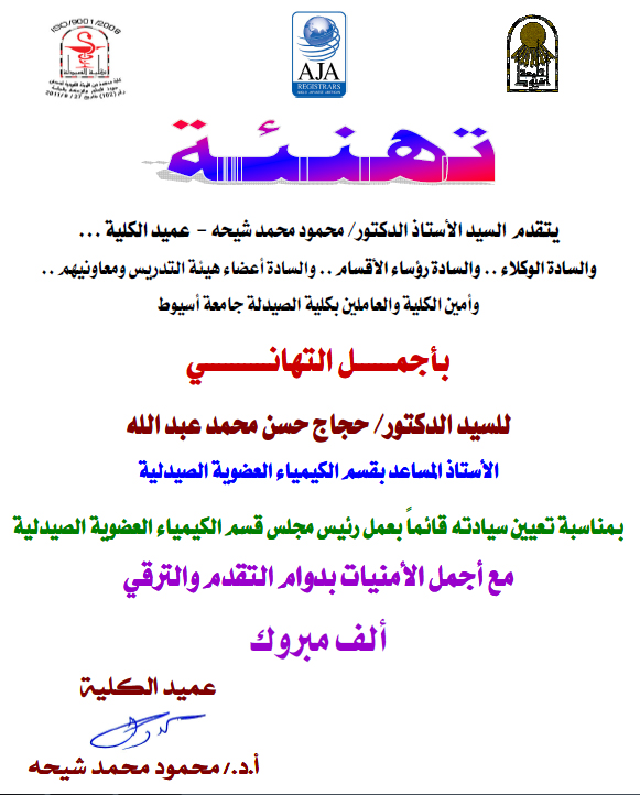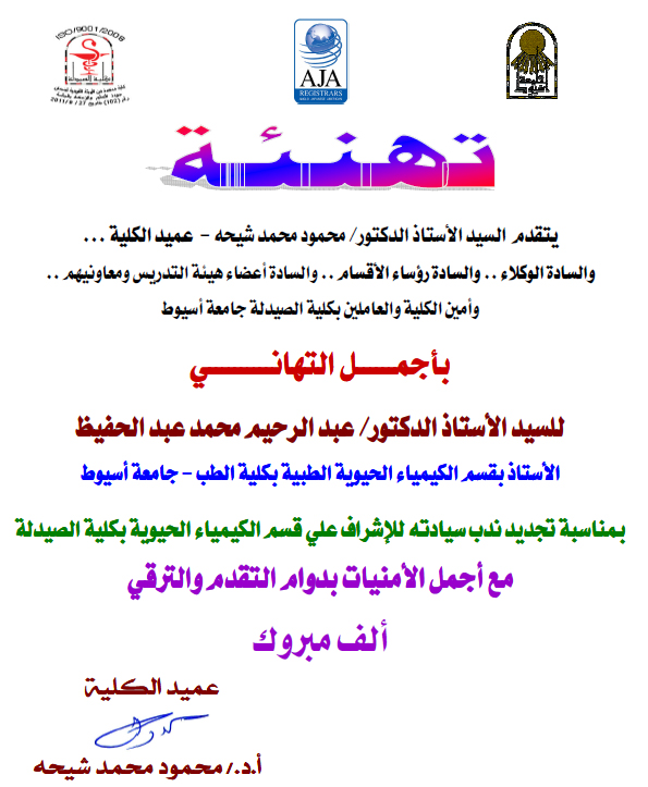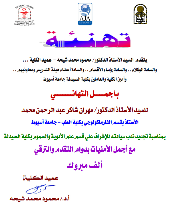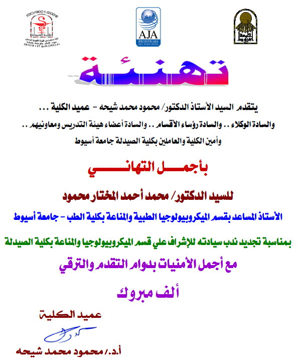 Faculty of Pharmacy Council (meeting number 688, held on 19/7/2020 and extended to 21/7/2020) approved the addition of Dr. Soad Abdel Latief Hassan - Associate Professor of Pharmacognosy and Director of Information Technology Unit, Faculty of Pharmacy, Assiut University - to the supervision committee for the Master Thesis of Pharmacist: Alaa Galal Amin - Registered (from abroad) to obtain the Master degree in Pharmaceutical Sciences (Microbiology and Immunology), to become the supervision committee as follows: