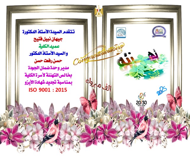Prof. Dr. Gihan Nabil Hassan Fetih - Dean of the Faculty , Prof. Dr. Hassan Refaat Hassan - Director of the Quality Assurance Unit congratulate the Faculty family for the Renewal of certification ISO 9001 : 2015