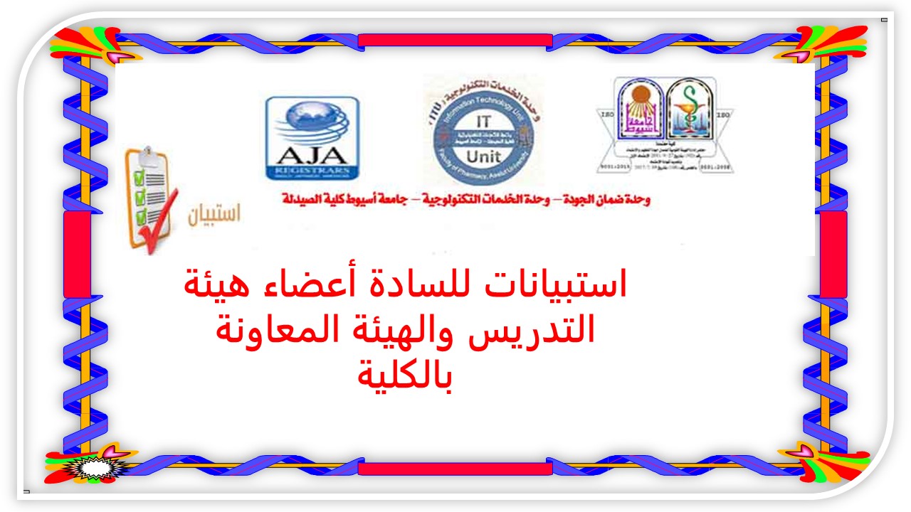 يسر كلية الصيدلة جامعة أسيوط وهى بصدد إعداد خطتها الإستراتيجية أن تستفيد بآرئكم البناءة فى ذلك.  ويهدف هذا الإستبيان تحليل البيئة الداخلية للكلية للتعرف على نقاط القوة والضعف المؤثرة على الكلية، ولذلك يرجى ملئ الاستبيانات الالكترونية التالية :-