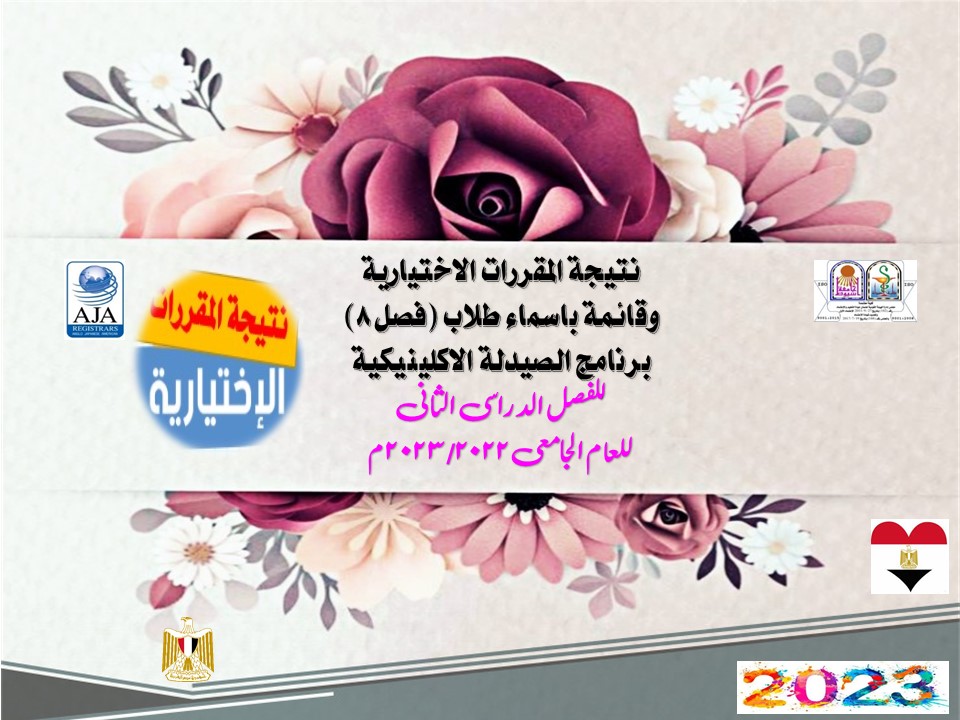 Result of elective courses and a list of students’ names Semester 8 Clinical Pharmacy Program for the second semester of the academic year 2022/2023 8 February 2023 Click ? قائمة بأسماء طلاب للمقررات الاختيارية