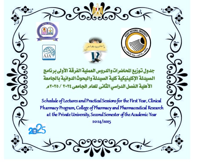 Schedule of Lectures and Practical Lessons for the First Year, Clinical Pharmacy Program, Faculty of Pharmacy and Pharmaceutical Research at the National University, Second Semester of the Academic Year 2024/2025