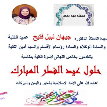Prof. Dr. Gihan Nabil Hassan Fetih– Dean of the Faculty The Vice Deans, Department Heads, and the Faculty Secretary Extend their heartfelt congratulations to the Faculty family on the occasion of the blessed Eid al-Fitr. May Allah return it to the Islamic