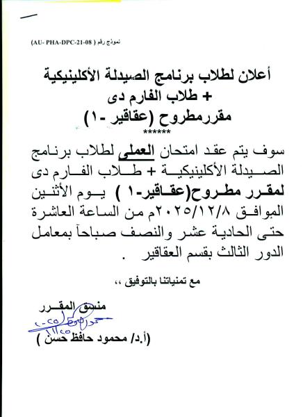Announcement for PharmD and PharmD (Clinical Pharmacy) students: The practical exam for the Matrouh Pharmacognosy -1 course will be held on Monday, December 8, 2025.
