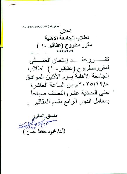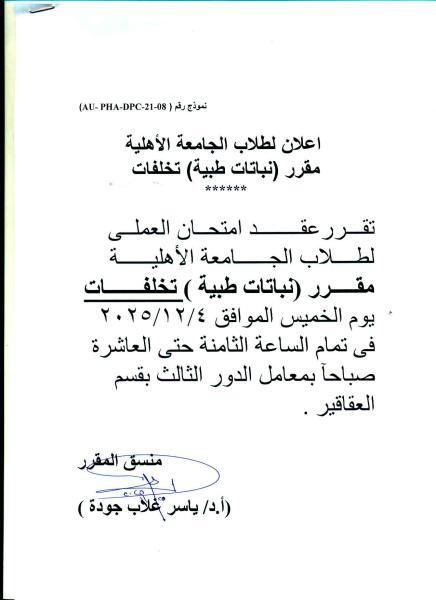 Announcement for Al-Ahliya University Students The midterm (coursework) exam for the Matrouh Pharmacognosy-1 course will be held on Tuesday, 25 November 2025.