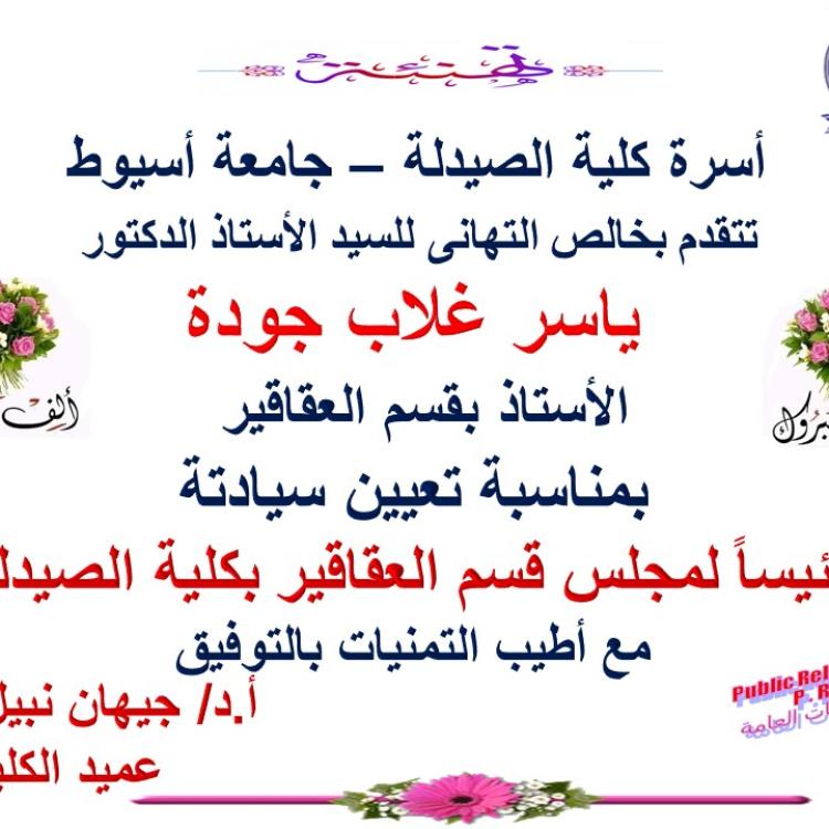 Congratulations on the appointment of Prof. Dr. Yaser Ghallab Gouda Hussein as Chairman of the Department of Pharmacognosy