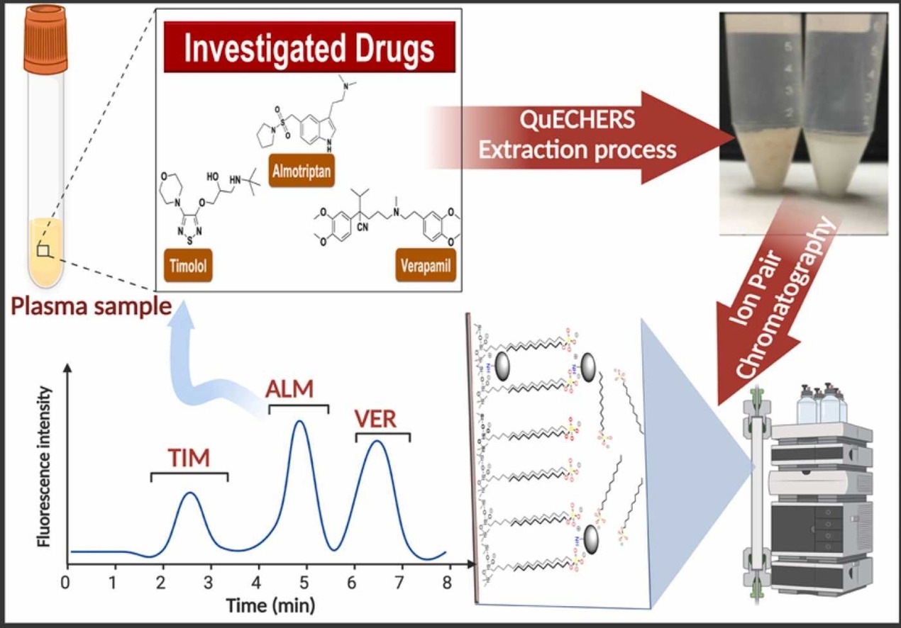 Antimigraine combination therapy has shown significant effectiveness in relieving pain, as well as reducing the frequency, duration, and severity of migraine attacks if compared to a single migraine medication. This work represents the first analytical investigation for emphasizing the synergistic effect of combining ophthalmic beta blockers with triptans in migraine treatment. The presented study was conducted to investigate the pharmacokinetic profile of almotriptan (ALM), a serotonin (5-HT1B/1Dreceptor agonist used to treat migraine, when coadministered with timolol (TIM) or verapamil (VER) which are considered as an adjuvant therapy in migraine prevention. Ion pair chromatography (IPC) with online fluorescence detection was applied to simultaneously detect and quantify the binary mixtures of ALM/TIM and ALM/VER in rabbit plasma samples. The separation was achieved using a Platinum C18 analytical column with a mobile phase composed of methanol: 35 mmol L-1 phosphate buffer solution containing 10 mmol L-1 SDS at pH = 6.8 (60:40 v/v). Several parameters were evaluated during the optimization of separation conditions including mobile phase composition, buffer concentration, buffer pH and concentration of ion pair reagent. A thorough investigation of the retention mechanism was performed, and the results showed that Coulomb forces were the main contributors to the overall retention mechanism, which may be hydrophobically assisted. QuEChERS extraction technique was utilized to extract the investigated drugs from plasma samples and a detailed study was carried out to optimize partition/extraction solvents, pH, extraction salts, sample volume and clean-up step. The method had a limit of detection and quantitation of 5.6 and 16.9 ng mL-1 for ALM in ALM/TIM mixture and 2.5 and 7.6 ng mL-1 for ALM in ALM/VER mixture, with an overall recovery not less than 95.22%. This newly proposed method offers a faster alternative to existing chromatographic methods for extraction and determination of ALM in binary mixtures with TIM or VER in rabbit plasma and provides a platform for studying pharmacokinetic parameters. The coadministration of either TIM or VER with ALM resulted in a notable rise in Cmax (maximum plasma concentration) and AUC (area under the plasma concentration-time curve) of ALM, implying possible alterations in the absorption and overall exposure of ALM.