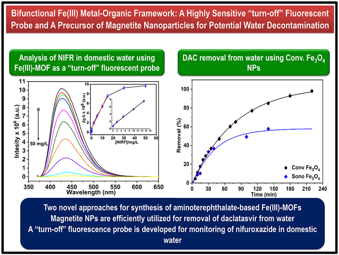 Nowadays growing concerns are rising toward water contamination caused by pharmaceuticals. Consequently, the design of optical sensors for their detection and analysis is extremely essential. In the current work, iron (III) aminoterephthalate-based metal-organic framework (Fe(III)-MOF) was synthesized by two approaches i.e. conventional and ultrasonication without the use of any organic solvents. Calcination of the synthesized Fe(III)-MOFs resulted in formation of different iron oxide phases i.e. magnetite and hematite depending on the calcination conditions. Magnetite NPs obtained from calcination of conventionally prepared MOF were efficiently utilized in the removal of daclatasvir (DAC), a hepatitis C antiviral drug, from water. Adsorption mechanism was investigated, and it was found that electrostatic interaction is the main force governing the adsorption of DAC on the magnetite NPs surface. Moreover, adsorption kinetics was studied, and it was established that adsorption of DAC on magnetite NPs surface follows pseudo-second order kinetics with R2 = 0.9970. The removal efficiency reached 99.9% after 220 min while using 5.0 mg/L of DAC. Furthermore, conventionally prepared Fe(III)-MOF showed higher fluorescence signal than ultrasonically-prepared MOF (∼3.0 times). This finding was exploited for utilization of conventionally prepared Fe(III)-MOF as a highly sensitive “turn-off” fluorescent probe for the analysis of nifuroxazide (NIFR) in domestic water. Parameters affecting sensing properties such as pH, solvent type and concentration of Fe(III)-MOF were optimized. The highest fluorescence quenching efficiency of NIFR was achieved while using 50 mg/L of Fe(III)-MOF in pH 9.0. Inner-filter effect was verified experimentally and mathematically to be the principal mechanism of the fluorescence quenching. The developed strategy showed high selectivity and sensitivity towards the analysis of NIFR with limit of detection and quantitation of 8.0 and 25.0 μg/L, respectively. Moreover, the designed sensor was successfully applied for determination of NIFR in domestic water without any interference from other tested antiviral, antidiabetic or antimicrobial drugs.
