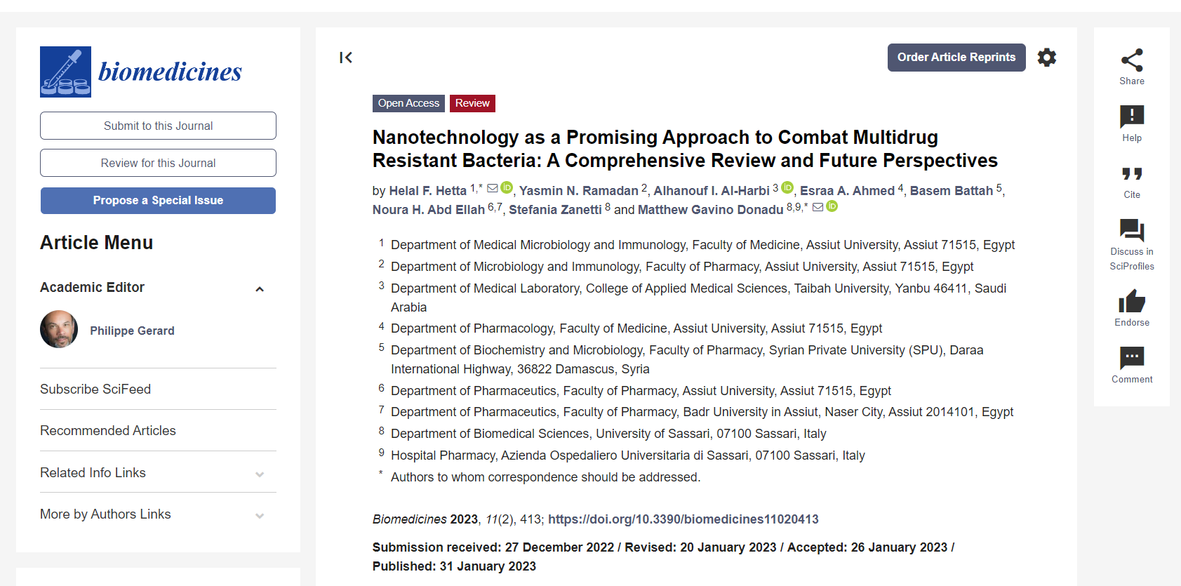 The wide spread of antibiotic resistance has been alarming in recent years and poses a serious global hazard to public health as it leads to millions of deaths all over the world. The wide spread of resistance and sharing resistance genes between different types of bacteria led to emergence of multidrug resistant (MDR) microorganisms. This problem is exacerbated when microorganisms create biofilms, which can boost bacterial resistance by up to 1000-fold and increase the emergence of MDR infections. The absence of novel and potent antimicrobial compounds is linked to the rise of multidrug resistance. This has sparked international efforts to develop new and improved antimicrobial agents as well as innovative and efficient techniques for antibiotic administration and targeting. There is an evolution in nanotechnology in recent years in treatment and prevention of the biofilm formation and MDR infection. The development of nanomaterial-based therapeutics, which could overcome current pathways linked to acquired drug resistance, is a hopeful strategy for treating difficult-to-treat bacterial infections. Additionally, nanoparticles’ distinct size and physical characteristics enable them to target biofilms and treat resistant pathogens. This review highlights the current advances in nanotechnology to combat MDR and biofilm infection. In addition, it provides insight on development and mechanisms of antibiotic resistance, spread of MDR and XDR infection, and development of nanoparticles and mechanisms of their antibacterial activity. Moreover, this review considers the difference between free antibiotics and nanoantibiotics, and the synergistic effect of nanoantibiotics to combat planktonic bacteria, intracellular bacteria and biofilm. Finally, we will discuss the strength and limitations of the application of nanotechnology against bacterial infection and future perspectives