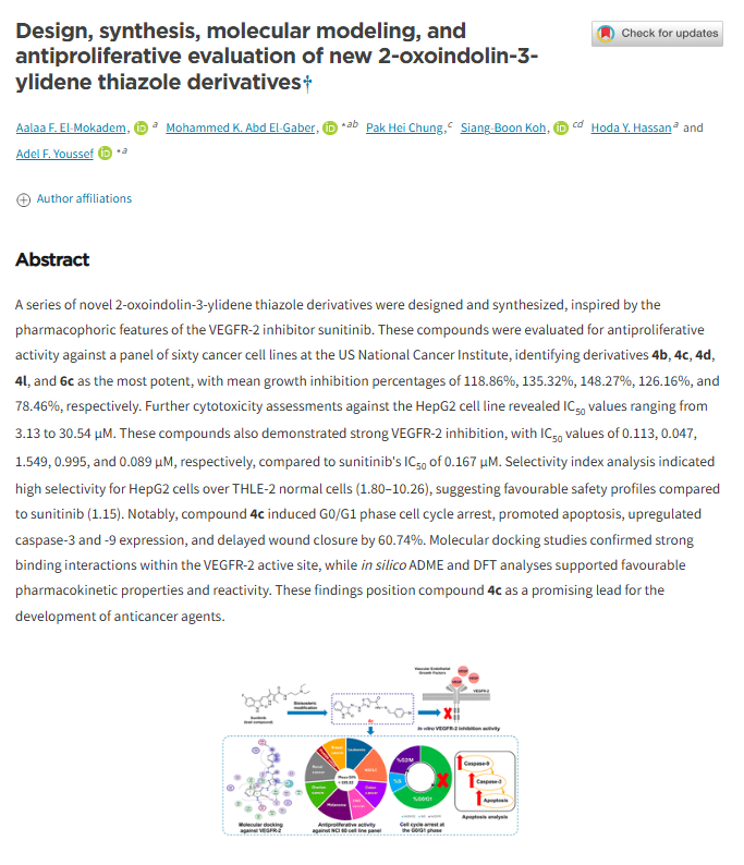 A series of novel 2-oxoindolin-3-ylidene thiazole derivatives were designed and synthesized, inspired by the pharmacophoric features of the VEGFR-2 inhibitor sunitinib. These compounds were evaluated for antiproliferative activity against a panel of sixty cancer cell lines at the US National Cancer Institute, identifying derivatives 4b, 4c, 4d, 4l, and 6c as the most potent, with mean growth inhibition percentages of 118.86%, 135.32%, 148.27%, 126.16%, and 78.46%, respectively. Further cytotoxicity assessments against the HepG2 cell line revealed IC50 values ranging from 3.13 to 30.54 μM. These compounds also demonstrated strong VEGFR-2 inhibition, with IC50 values of 0.113, 0.047, 1.549, 0.995, and 0.089 μM, respectively, compared to sunitinib's IC50 of 0.167 μM. Selectivity index analysis indicated high selectivity for HepG2 cells over THLE-2 normal cells (1.80–10.26), suggesting favourable safety profiles compared to sunitinib (1.15). Notably, compound 4c induced G0/G1 phase cell cycle arrest, promoted apoptosis, upregulated caspase-3 and -9 expression, and delayed wound closure by 60.74%. Molecular docking studies confirmed strong binding interactions within the VEGFR-2 active site, while in silico ADME and DFT analyses supported favourable pharmacokinetic properties and reactivity. These findings position compound 4c as a promising lead for the development of anticancer agents.