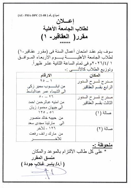 The midterm exam for the course (Pharmacognosy I) will be held for Al Ahliyya University students on Wednesday, April 1, 2026, at 12:00 PM.