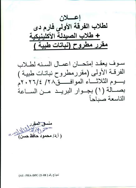 Announcement 1st Year Pharm-D & Clinical Pharmacy Students Midterm Exam: Medicinal Plants (Elective Courses) will be held on: Tuesday, April 28, 2026 16 April 2026 The Midterm exam for 1st Year students (Medicinal Plants - Elective Courses) will be held on:Tuesday, April 28, 2026Time: Starting from 9:00 AM.Location: Hall (1), located next to the Post Office.