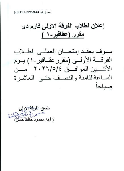 Announcement for First-Year Pharm D Students Practical Exam – Pharmacognosy Iwill be held on Monday, May 4, 2026 26 April 2026 The practical exam for First-Year students (Pharmacognosy I) will be held on:Monday, May 4, 2026 from 8:30 AM to 10:00 AM.