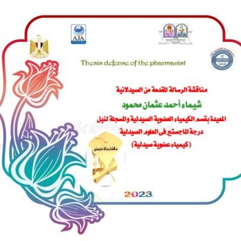 Thesis defense of the pharmacist Shaima Ahmed Othman Mahmoud - teaching assistant in the Department of Pharmaceutical Organic Chemistry and registered to obtain a master’s degree in pharmaceutical sciences - on Wednesday, September 27, 2023.