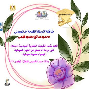 Thesis defense of the pharmacist/ Mahmoud Saleh Mahmoud Fahmy - teaching assistant in the Department of Pharmaceutical Organic Chemistry and registered to obtain a master’s degree in pharmaceutical sciences (Pharmaceutical Organic Chemistry) on Thursday,