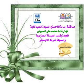 The thesis defense of the pharmacist / Nihal Thabet Muhammad Ali Al-Subaiti, teaching assistant in the Department of Industrial Pharmacy, who is registered for the master's degree