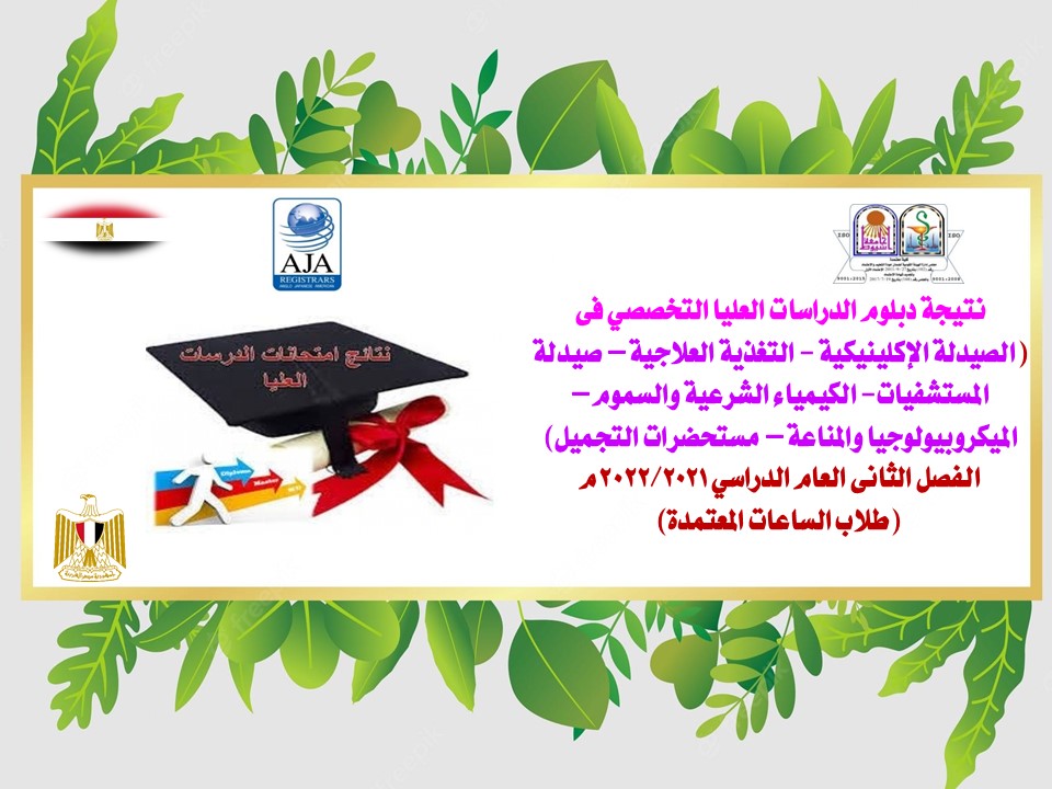 Result of a specialized postgraduate diploma in (clinical pharmacy - therapeutic nutrition - hospital pharmacy - forensic chemistry and toxicology - microbiology and immunity - cosmetics) second semester of the academic year 2021/2022 (credit hour student
