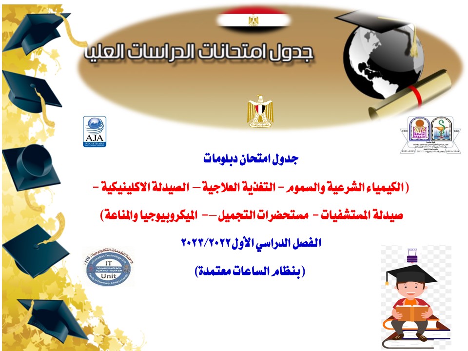 Schedule of Examinations for the Diploma degree (Forensic Chemistry and Toxicology - Clinical Nutrition - Clinical Pharmacy - Hospital Pharmacy - Cosmetics - Microbiology and Immunology) First Semester 2022/2023 (credit hour system) 11 January 2023