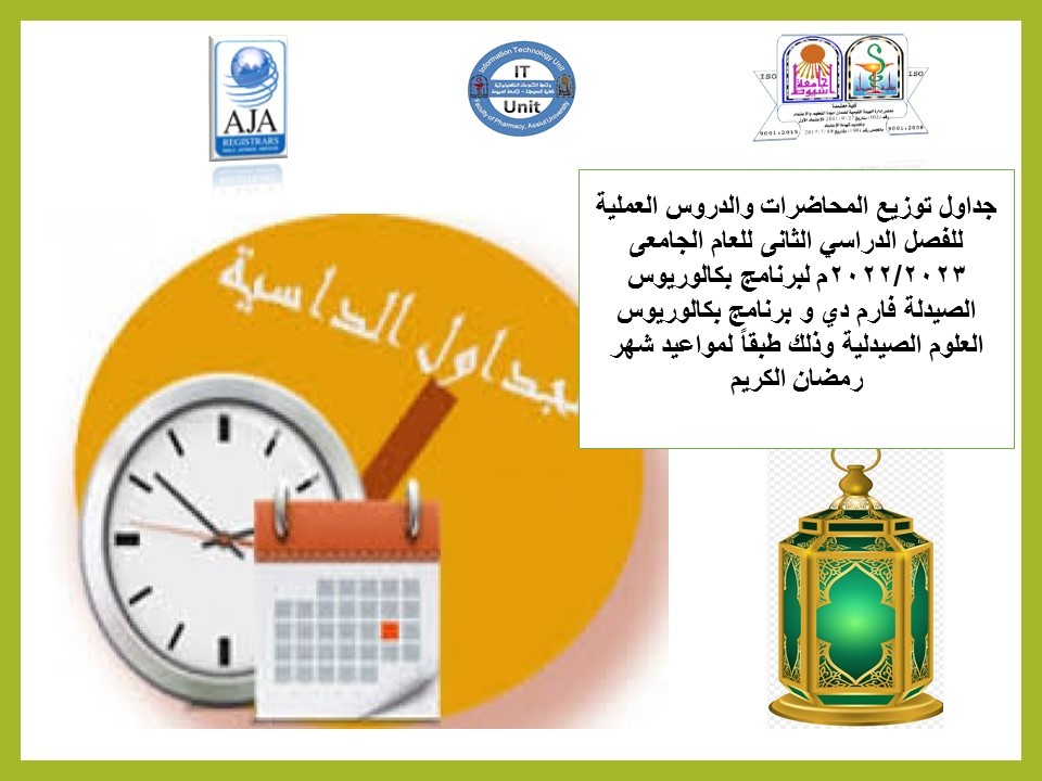 Schedules of lectures and practical lessons for the second semester of the academic year 2022/2023 for the Bachelor of Pharmacy program Pharm D and the Bachelor of Pharmaceutical Sciences program, according to the dates of the holy month of Ramadan