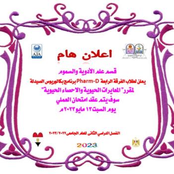 The Department of Pharmacology and Toxicology announces to students of the fourth year, Pharm-D, the Bachelor of Pharmacy program for the course "Biostatistics". The practical exam will be held on Saturday, May 13, 2023.