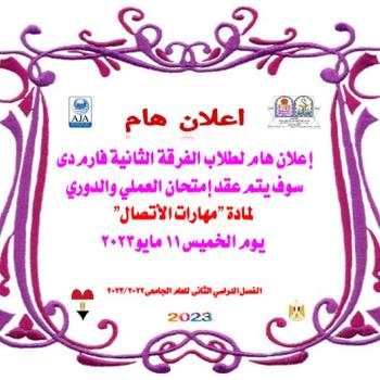 An important announcement for the students of the second year Pharm D. The practical and periodic exam for the "Communication Skills" Course will be held on Thursday, May 11, 2023