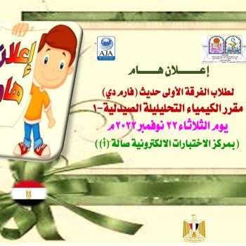 Important Announcement for First-year Students (Pharm D) the midterm exam for Pharmaceutical Analytical Chemistry-1 on Tuesday, November 22, 2022 (in the Electronic Exam Center, Hall (A))