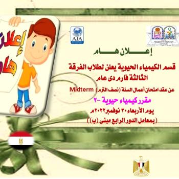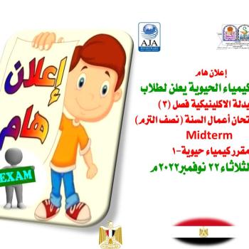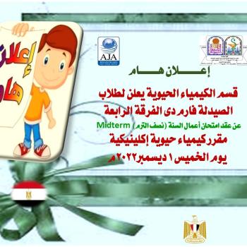 The Department of Biochemistry announces to the students of the third year, Pharm D, that the midterm exam will be held for Biochemistry2 Course on Wednesday, November 30, 2022 (in the fourth floor laboratory, Building (B))