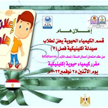 The Department of Biochemistry announces to clinical pharmacy students, class (7) of holding the midterm exam for a clinical biochemistry course on Monday, November 28, 2022