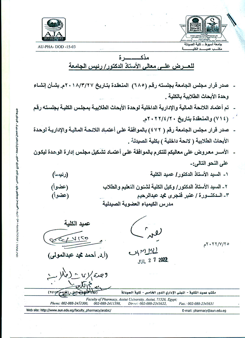 The establishment of the Student Research Unit at the Faculty of Pharmacy at the University Council No. 685 held on 27/3/2018 was approved, headed by Prof. Ahmed Abdo Geis