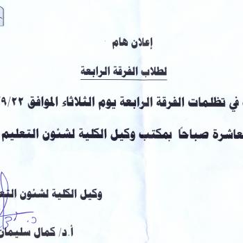 تقرر البت في تظلمات الفرقة الرابعة يوم الثلاثاء الموافق 22/9/2020م الساعة العاسرة صباحاً بمكتب الكلية لشئون التعليم والطلاب.