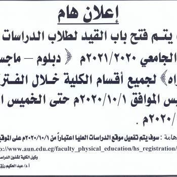 سوف يتم فتح باب القيد لطلاب الدراسات العليا للعام الجامعي 2020/2021م ((دبلوم-ماجستير-دكتوراه)) لجميع أقسام الكلية خلال الفترة من الخميس الموافق 1/10/2020م…