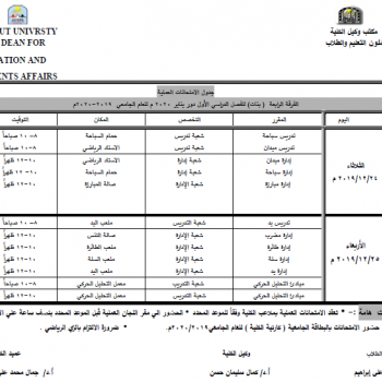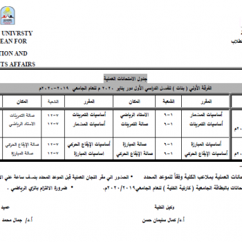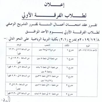 تقرر عقد امتحان أعمال السنة لمقرر التشريح الوصفي لطلاب الفرقة الأولى يوم الأحد الموافق 8/12/2019م بمدرج (1،2) بكلية التربية الرياضية على النحو المرفق…