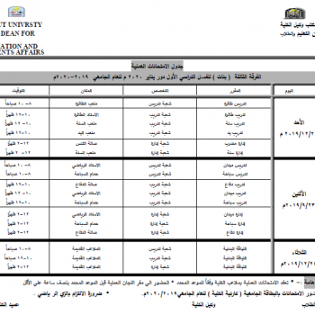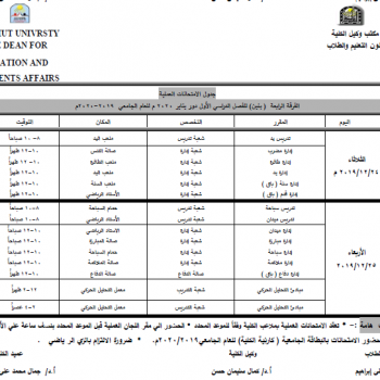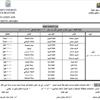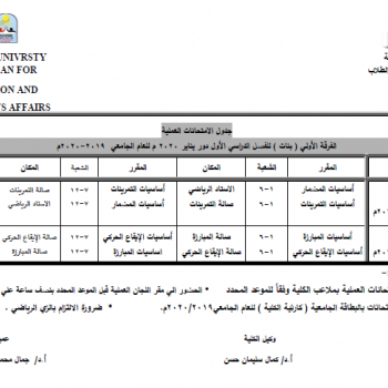 جدول الامتحانات العملية الفرقة الثانية ( بنين ) للفصل الدراسي الأول دور يناير 2020 م للعام الجامعي 2019-2020م