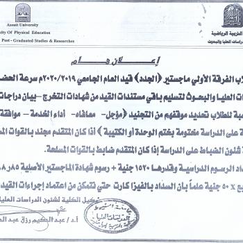** على جميع طلاب الفرقة الأولى ماجستير (الجدد) قبد العام الجامعي 2019/2020 سرعة الحضور لإدارة الدراسات العليا والبحوث لتسليم باقي مستندات القيد من شهادات التخرج - بيان درجات 4 سنوات. ** بالنسبة…