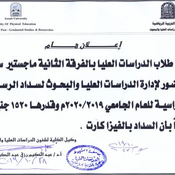 على طلاب الدراسات العليا بالفرقة الثانية ماجستير سرعة الحضور لإدارةالدراسات العليا والبحوث لسداد الرسوم الدراسية للعام الجامعي 2019/2020 وقدرها 1520 جنية…