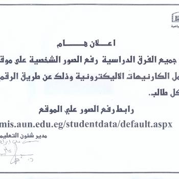 على طلاب جميع الفرق الدراسية رفع الصور الشخصية على موقع (mis) وذلك لعمل الكارنيهات الإلكترونية وذلك عن طريق الرقم القومي الخاص بكل طالب.