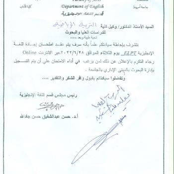 سوف يتم بمشيئة الله تعالى مناقشة رساله الماجستير ة للباحث /حاتم محمد حامد محمد المقيد بقسم المناهج وتدريس التربية الرياضية تحت عنوان " برنامج تربية حركية وأثرة على تنمية المهارات…