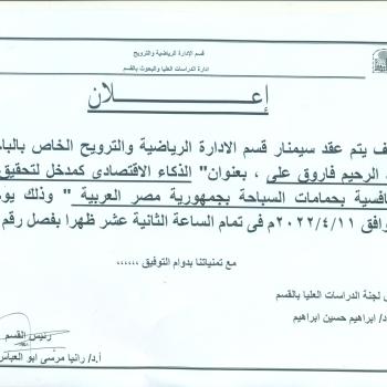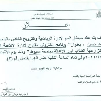 سوف يتم بمشيئة الله تعالى مناقشة رساله الماجستير للباحث / ناصر فهد سعد الحميدى ( وافد كويتى ) مقيد بقسم الادارة الرياضية والترويح وذلك يوم الجمعه الموافق 25/3/2022م الساعا1…