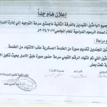 تم نشر جدول الامتحانات النظرية والعملية لجميع الفرق للفصل الدراسي الأول 2023-2024 على موقع الكلية بقسم جداول الإمتحانات…