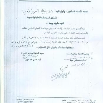 سوف يتم بمشئيه الله تعالى مناقشة رساله الماجستير للباحث/ عبد الرحمن داود المحيش بقسم العلوم التربوية والنفسية الرياضية ( باحث كويتى) وذلك يوم الجمعه الموافق /24/11/2023 ( مكتب…
