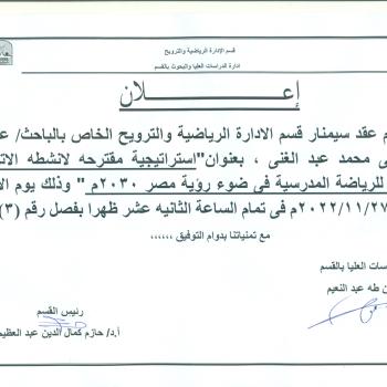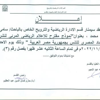 سوف يتم بمشئيه الله تعالى مناقشة رساله الدكتوراه للباحث / عبد الرازق احمد يوسف بقسم التدريب الرياضى وعلوم الحركه تحت عنوان " دراسه تحليلية بيوميكانيكية للمسارات الحركية كأساس لوضع برنامج…