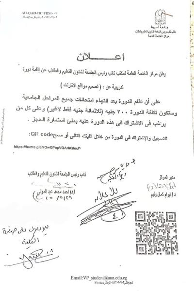 يُعلن مركز الخدمة العامة بمكتب نائب رئيس الجامعة لشؤون التعليم والطلاب عن بدء التسجيل في دورة تدريبية بعنوان تصميم مواقع الإنترنت، على أن تُعقد الدورة بعد انتهاء امتحانات جميع المراحل الجامعية، وتبلغ تكلفة الاشتراك ٣٠٠ جنيه فقط، ويُرجى من الراغبين في الالتحاق بالدورة استكمال استمارة الحجز من خلال الرابط التالي أو عبر مسح الـ QR Code المرفق: