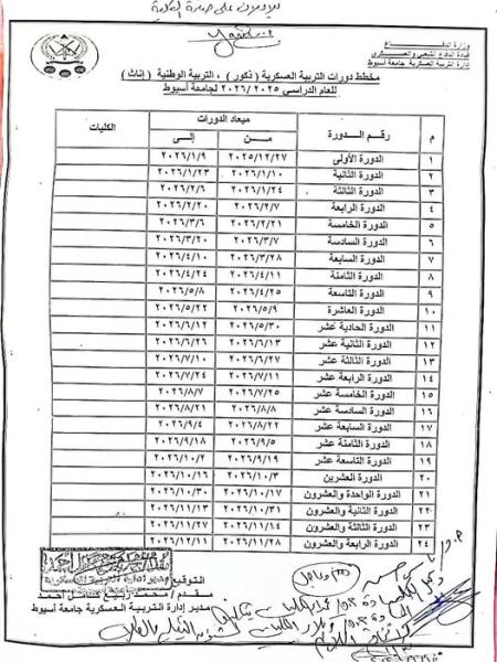 تعلن إدارة التربية العسكرية – جامعة أسيوط عن مخطط دورات التربية العسكرية (ذكور / إناث) للعام الدراسي 2025 / 2026م، وذلك وفقًا للمواعيد المحددة والمعتمدة رسميًا.
