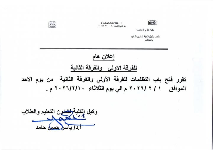 إعلان لطلاب الفرقة الأولى والفرقة الثانية 2026 27 يناير 2026 تقرر فتح باب تظلمات الفرقة الأولى والفرقه الثانية ابتداءا من يوم الأحد الموافق ١-٢-٢٠٢٦م وحتى الثلاثاء ١٠-٢-٢٠٢٦م.