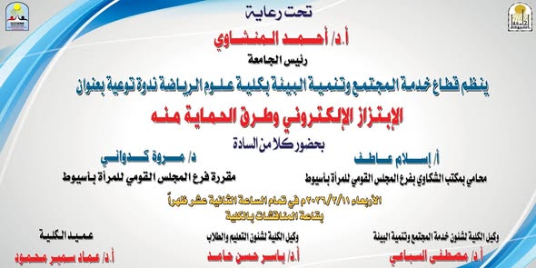 تحت رعاية الأستاذ الدكتور/ أحمد المنشاوي رئيس الجامعة، وفي إطار حرص الجامعة على القيام بدورها المجتمعي والتوعوي، نظم قطاع خدمة المجتمع وتنمية البيئة بكلية علوم الرياضة ندوة توعوية بعنوان "الابتزاز الإلكتروني وطرق الحماية منه"، نظمت هذه الفعالية تحت قيادة الأستاذ الدكتور/ عماد سمير محمود عميد الكلية ،وإشراف الأستاذ الدكتور/ ياسر حسن حامد وكيل الكلية لشئون التعليم والطلاب، والأستاذ الدكتور/ مصطفى السباعي وكيل الكلية لشئون خدمة المجتمع وتنمية البيئة،.