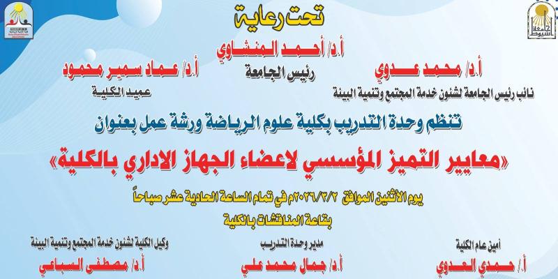 تحت رعاية كريمة من الأستاذ الدكتور/ أحمد المنشاوي رئيس جامعة أسيوط، والأستاذ الدكتور/ محمد عدوي نائب رئيس الجامعة لشئون خدمة المجتمع وتنمية البيئة، والأستاذ الدكتور/ عماد سمير عميد الكلية، نظمت وحدة التدريب بكلية علوم الرياضة ورشة عمل بعنوان «معايير التميز المؤسسي لأعضاء الجهاز الإداري بالكلية»، وذلك في إطار توجه الجامعة نحو دعم ثقافة الجودة والارتقاء بالأداء المؤسسي في مختلف القطاعات.